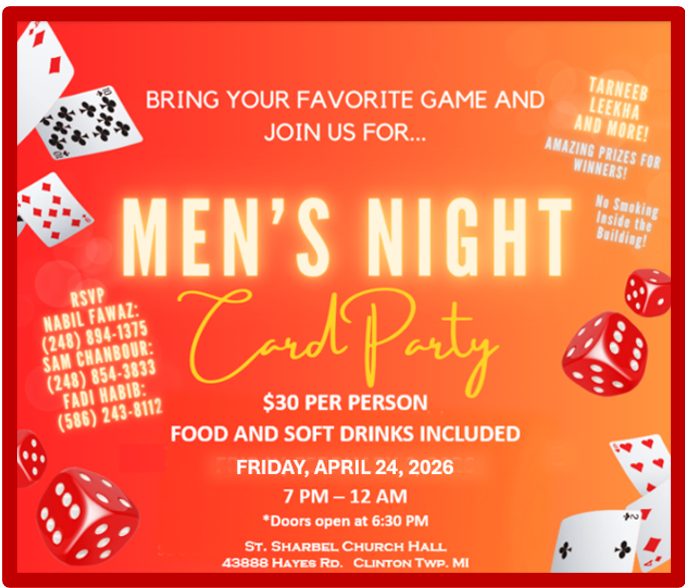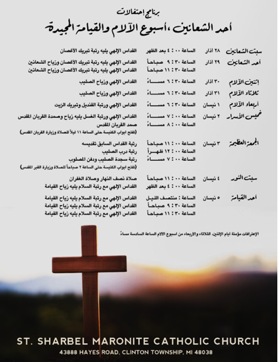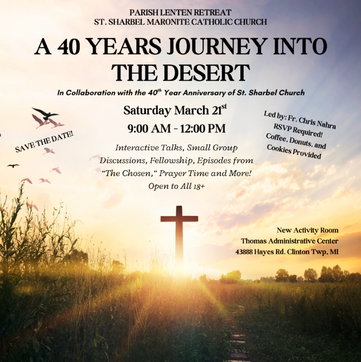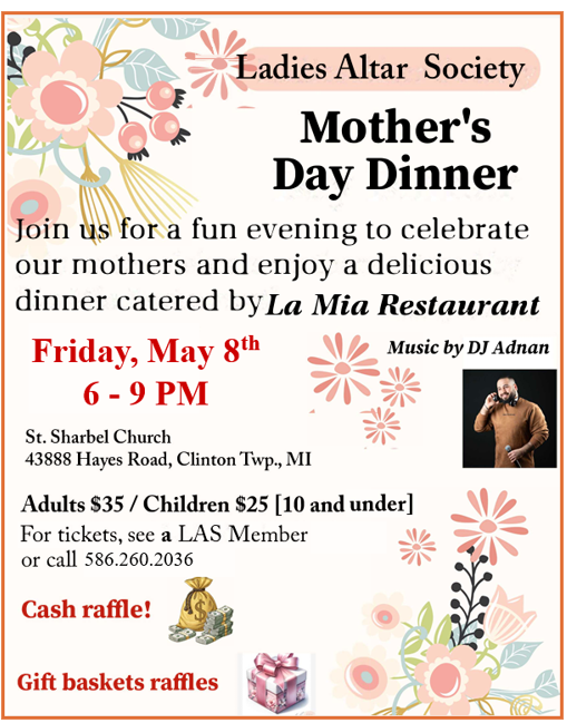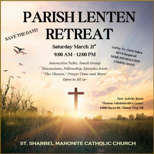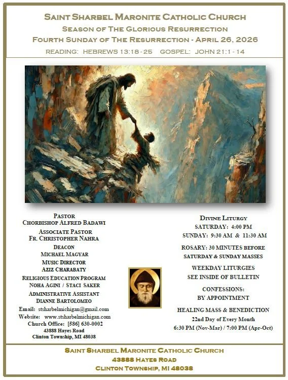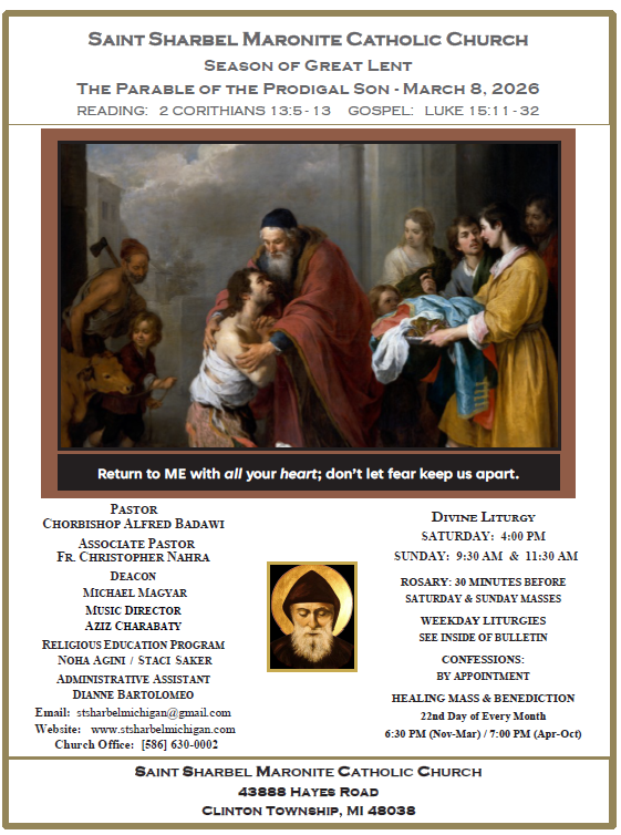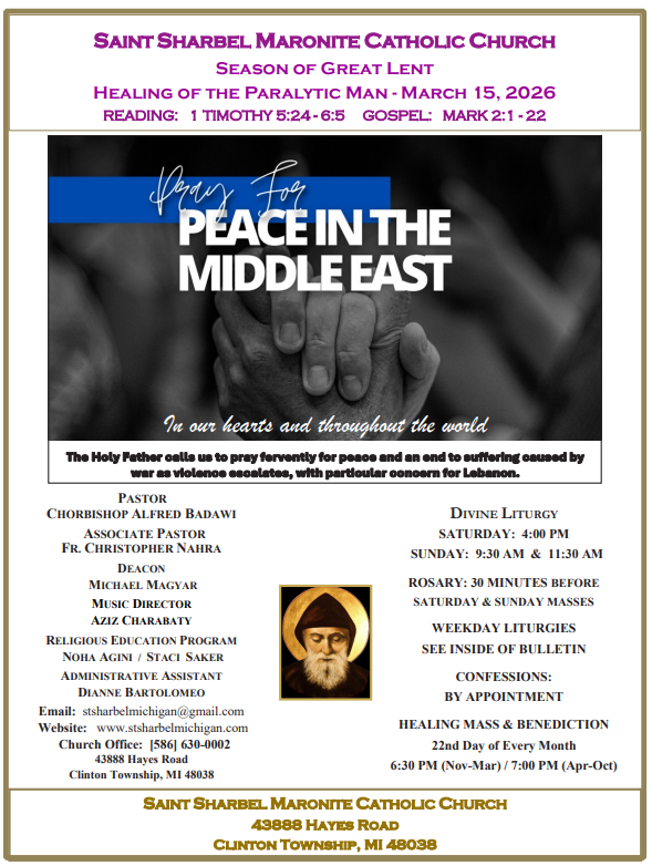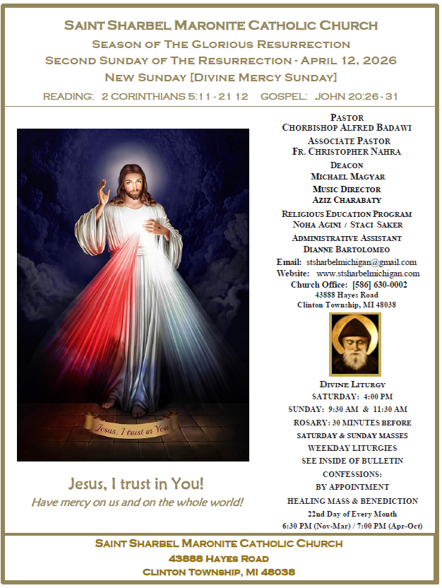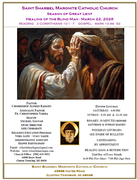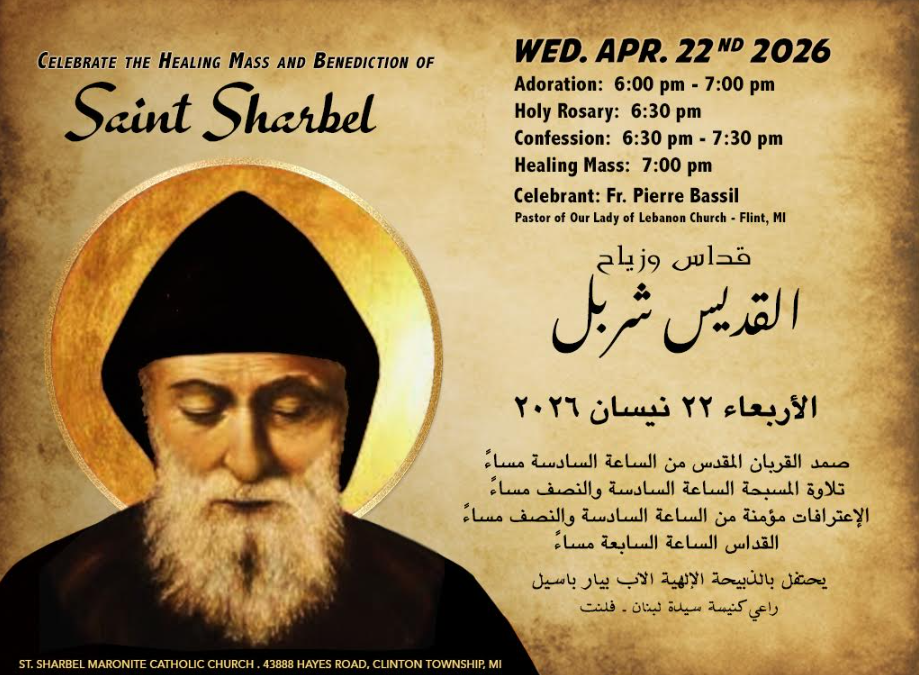 We invite you to join us for our next Healing Mass on March 22, 2026 at 6:30 PM. During this liturgy, we will pray for Saint Sharbel to intercede for our intentions, and everyone present will receive a special blessing with Saint Sharbel oil. Special intentions will be prayed for world peace and the Sanctity of Life. We hope that you will be able to join us!