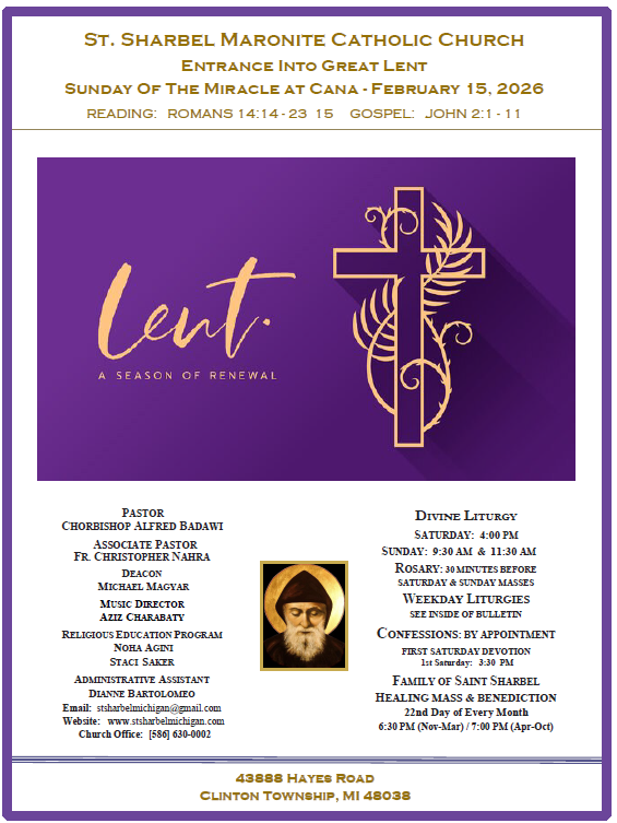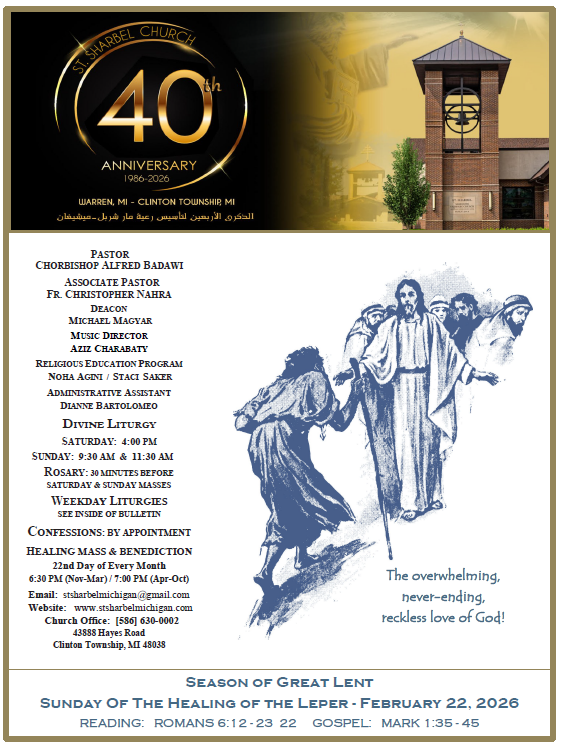 We invite you to join us for our next Healing Mass on February 22, 2026 at 6:30 PM. During this liturgy, we will pray for Saint Sharbel to intercede for our intentions, and everyone present will receive a special blessing with Saint Sharbel oil. Special intentions will be prayed for world peace and the Sanctity of Life. We hope that you will be able to join us!
