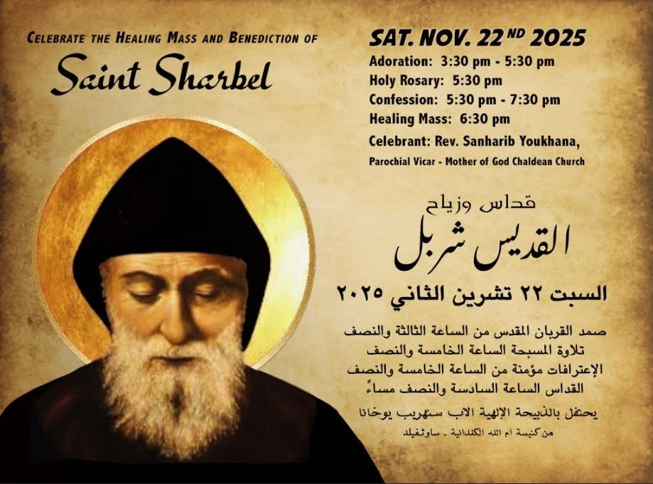 We invite you to join us for our next Healing Mass on November 22, 2025 at 6:30 PM. During this liturgy, we will pray for Saint Sharbel to intercede for our intentions, and everyone present will receive a special blessing with Saint Sharbel oil. Special intentions will be prayed for world peace and the Sanctity of Life. We hope that you will be able to join us!